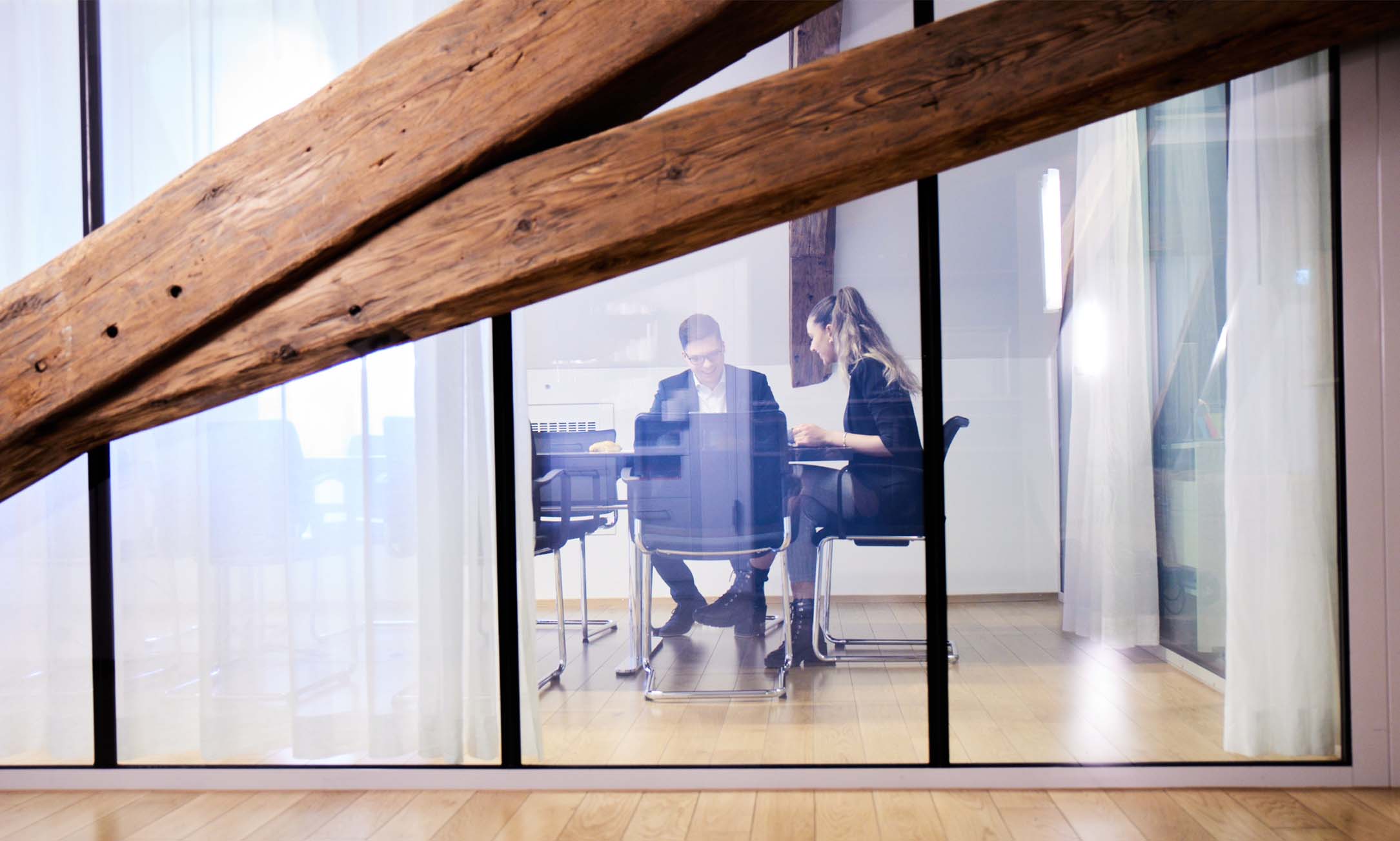 Ein kleineres Sitzungszimmer mit Parkettboden, einem langen schwarzeb Tisch, 6 Stühlen und weissen Vorhängen über verglasten Wänden.